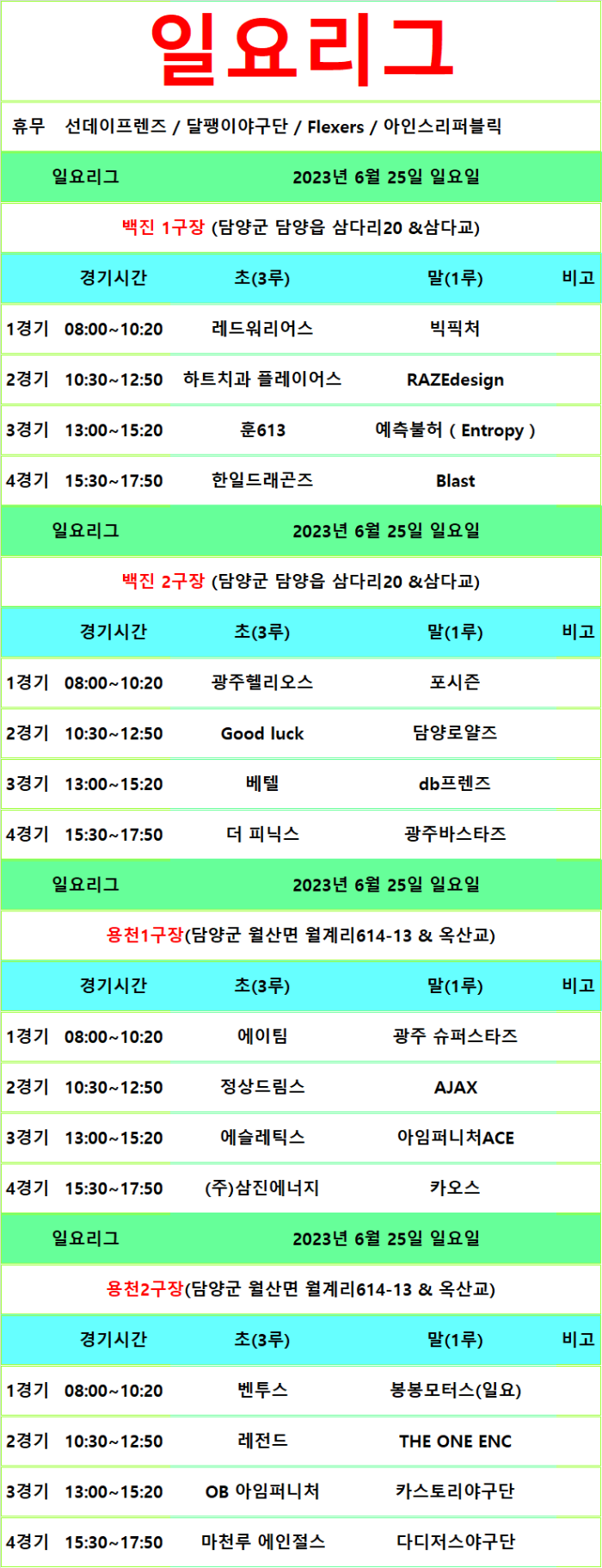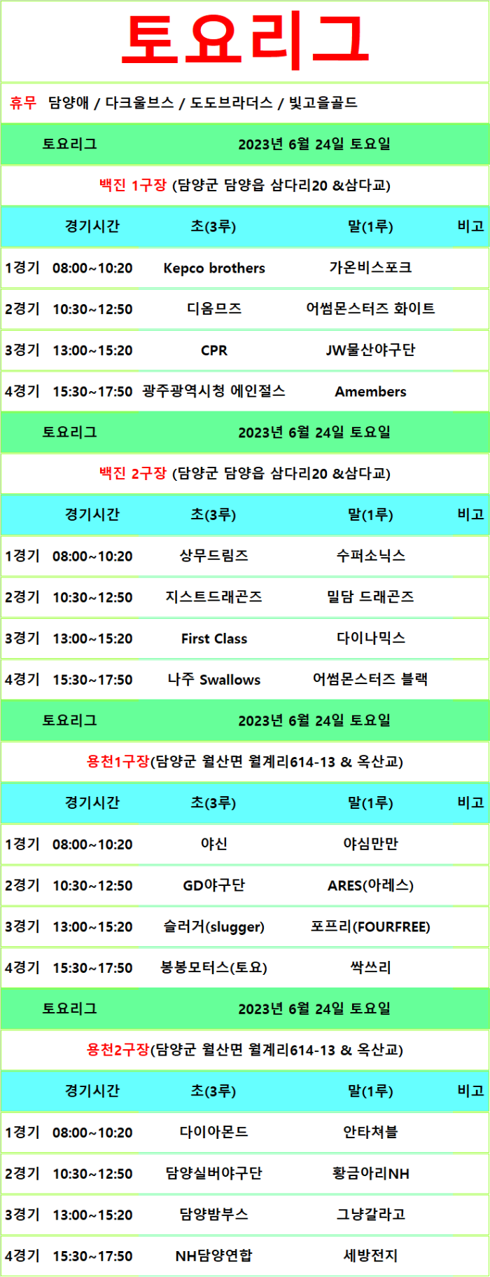 6월24일 ~25일 경기일정 (17주차)