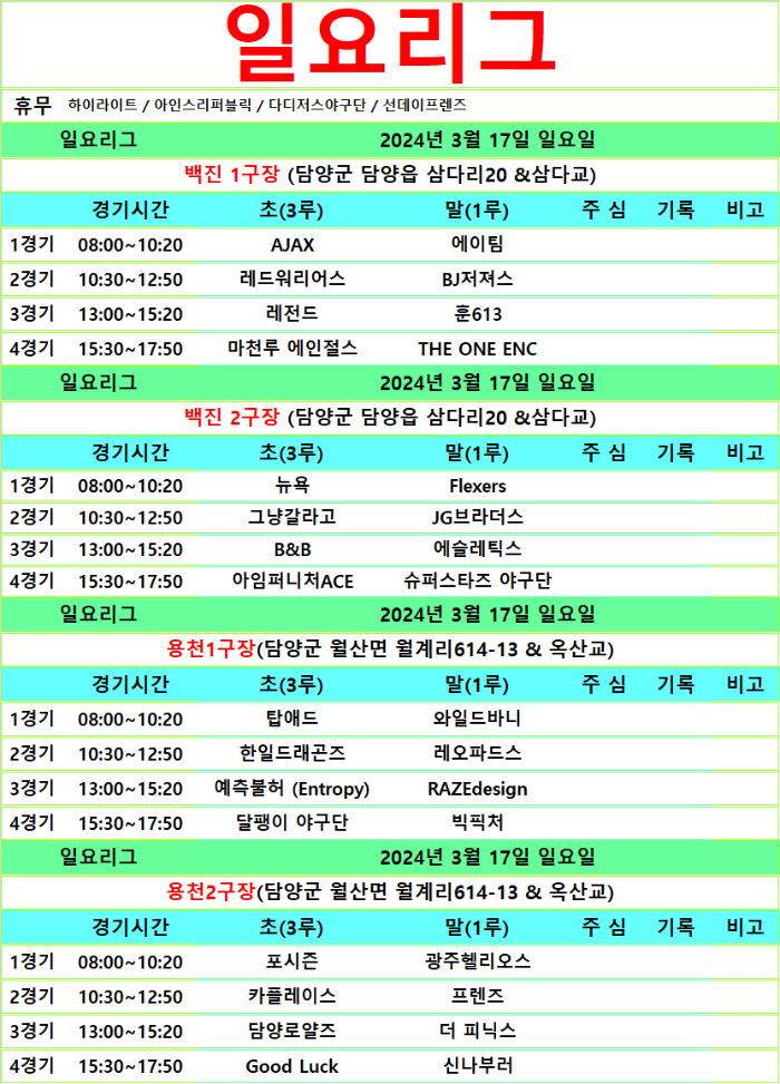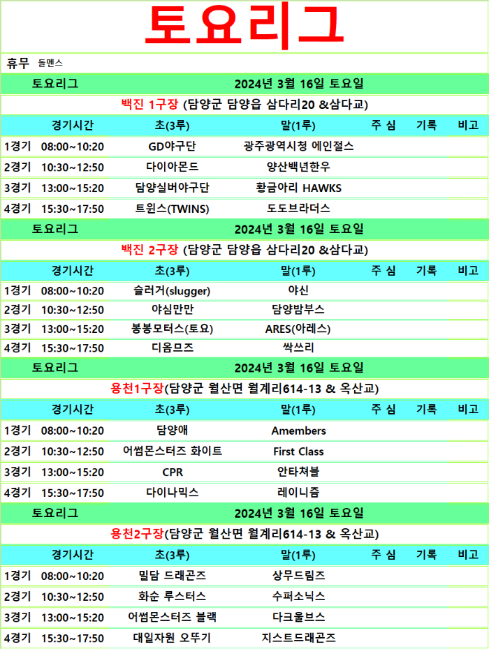3월 16.17일 경기일정입니다. (구장확인필수)
